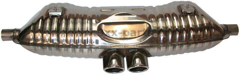 Äänenvaimennin. Ruostumaton teräs, tuplaulostuloilla. Alkuperäisen tyyppinen äänenvaimennin. Saatavana myös “Super Sound” versio.