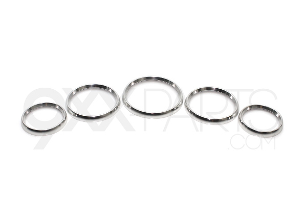 Mittariston koristekehyssarja. Kiiltävä alumiini. 1x 120mm, 2x 105mm, 2x 83mm.